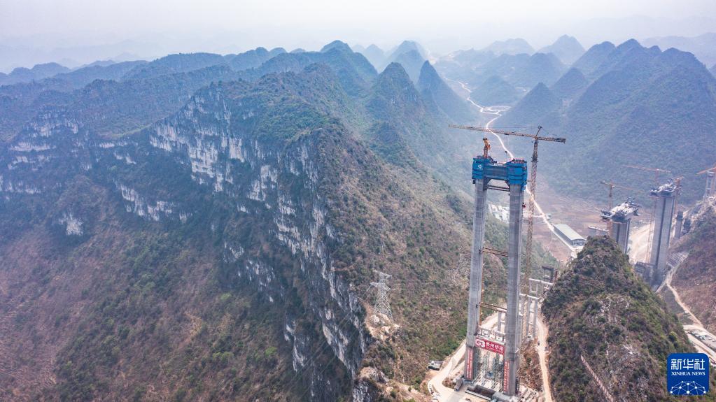 4月21日,六安高速花江峽谷大橋6號主塔順利實現封頂(無人機照片)。