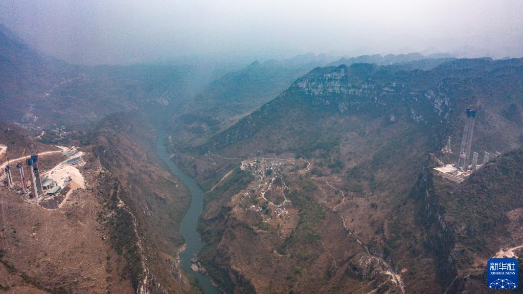4月21日,六安高速花江峽谷大橋6號主塔(圖右)順利實現封頂(無人機照片)。