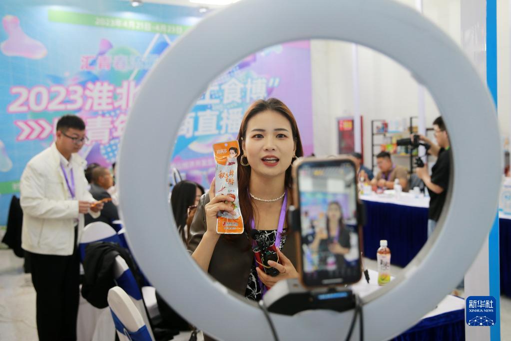 4月21日,在淮北市相山經濟開發區食品博覽園會展中心,參展商工作人員通過直播推銷食品。