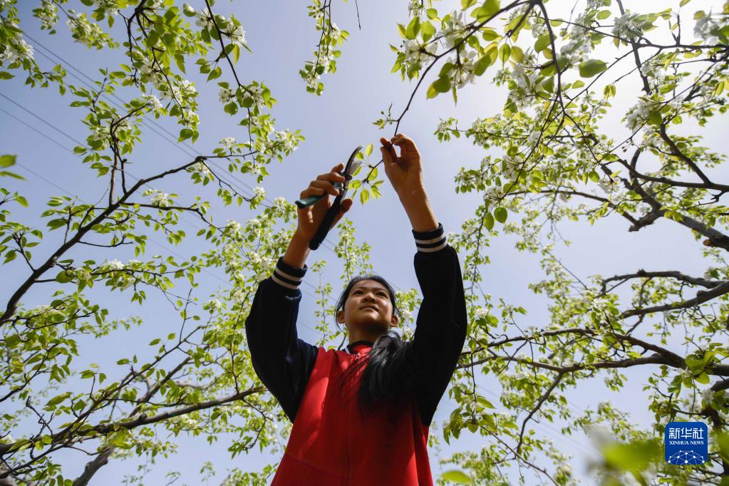 4月21日,承德縣新杖子小學學生在學習為梨樹梳花。