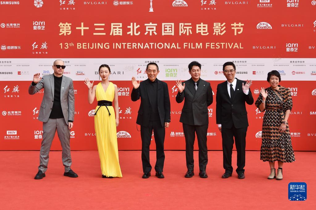 4月21日,本屆北京國際電影節“天壇獎”國際評委會成員張藝謀(左三)、關錦鵬(右二)、納達夫·拉皮德(左一)、萍帕卡·托維拉(右一)、張頌文(右三)和周冬雨亮相紅毯儀式。新華社記者 陳鐘昊 攝