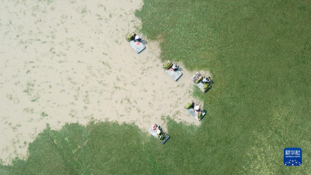 4月20日,工人在大通湖水生植物產業示范園內采收水草(無人機照片)。