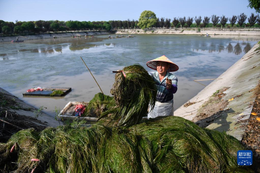 4月20日,工人在大通湖水生植物產業示范園內采收水草。