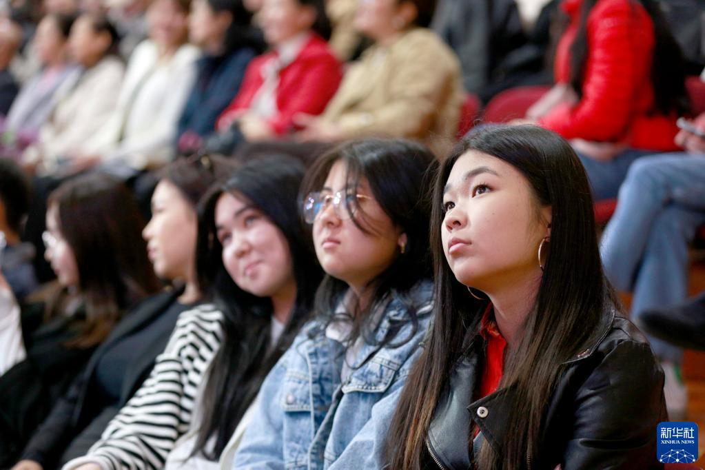 4月20日,青少年學生在吉爾吉斯斯坦首都比什凱克國立大學禮堂舉行的天宮對話——神舟十五號航天員乘組與上海合作組織國家青少年問答活動上聆聽航天員講話。
