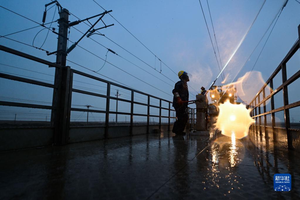 4月20日,中國鐵路青藏集團有限公司西寧供電段格爾木大修車間大修網工區檢修工使用高壓沖洗水槍對絕緣子設備進行清洗。