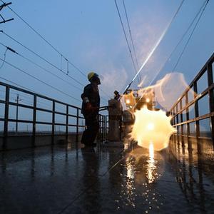 青藏鐵路從青海省海西蒙古族藏族自治州的察爾汗鹽湖橫穿而過,這一段約33公里的線路被稱為“萬丈鹽橋”。春季大風不僅揚沙,還會揚起察爾汗鹽湖的鹽,鹽污會在接觸網絕緣子表面附著,降低絕緣子的爬電距離,遇到雨雪天氣放電,造成接觸網大面積跳閘,影響青藏鐵路正常行車。近年來,西寧供電段加大科技投入,清洗方式由原來的使用抹布、噴水壺、小型清洗機轉變為高壓水槍,有效提升作業效率。