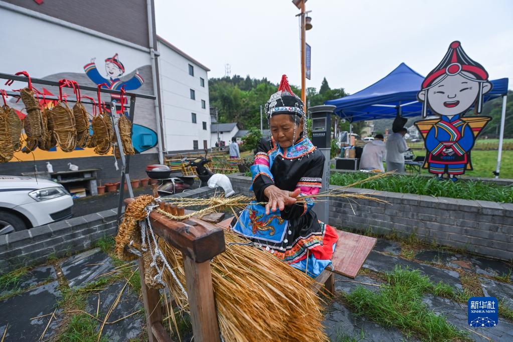 4月22日,畬族老人在團結村的“三月三”旅游文化周上展示編草鞋。