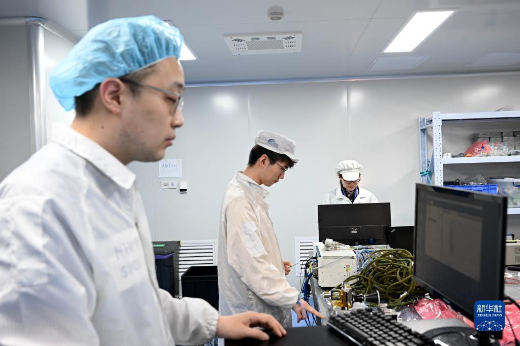 4月18日,在中科院合肥物質科學研究院,安徽光學精密機械研究所光學遙感研究中心副研究員路美娜(后)和同事李揚(中)、聶安然在進行載荷分系統聯調。