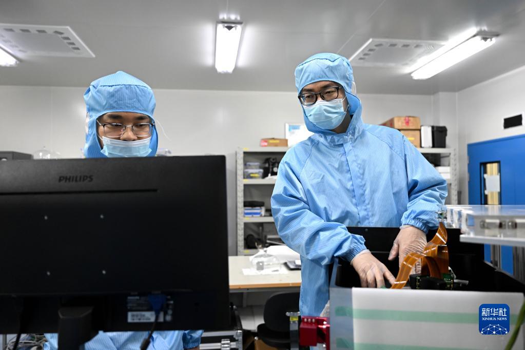 4月18日,在中科院合肥物質科學研究院,安徽光學精密機械研究所環境光學研究中心成像光譜技術研究室副主任周海金(右)和同事朱磊在測試成像光譜儀。