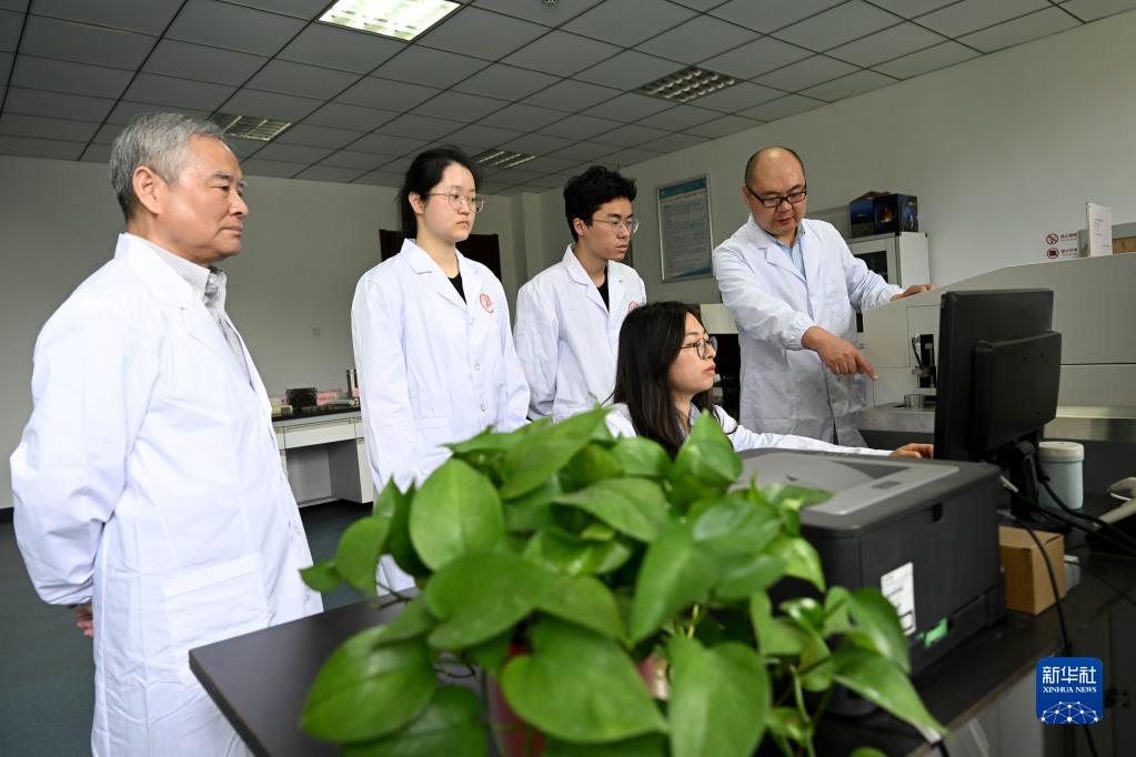 4月19日,在中科院合肥物質科學研究院,固體物理研究所特種航天金屬材料研究團隊研究員韓福生(左一)和副研究員王幸福(右一)在指導學生使用直讀光譜儀。