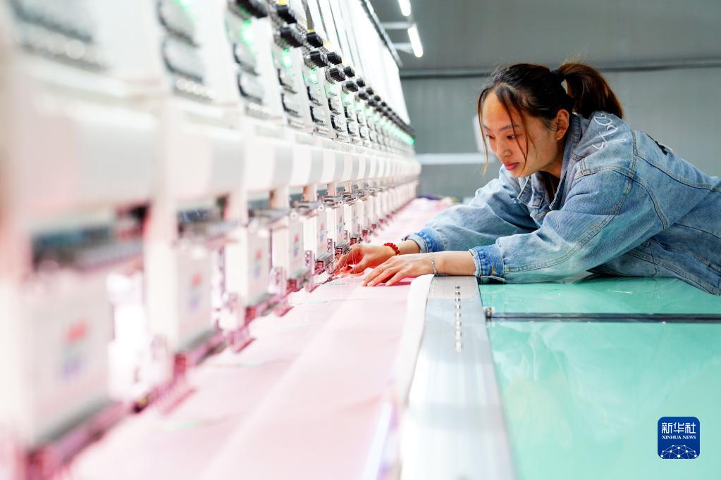 4月22日,在惠民縣桑落墅鎮“惠民工坊”,工作人員在針織機前修剪線頭。