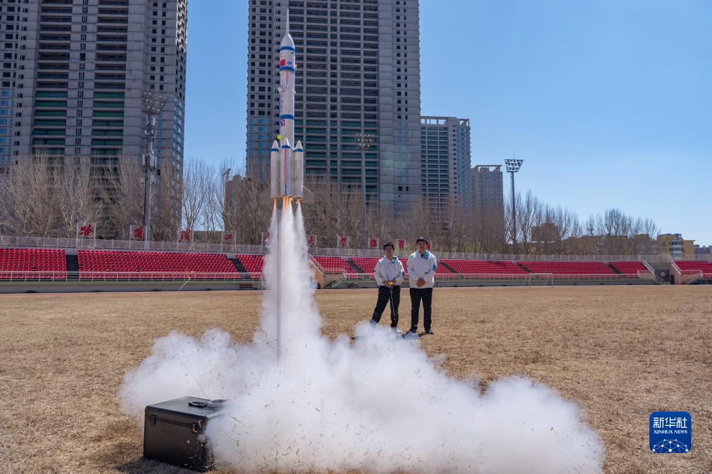 4月22日,在哈爾濱工業大學體育場,航模協會的學生操控航模點火發射。