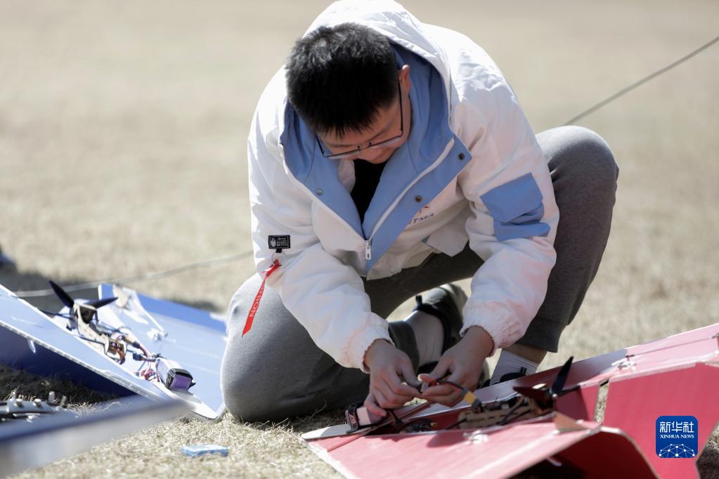 4月22日,在哈爾濱工業大學體育場,航模協會的學生在航模飛行表演前進行調試。