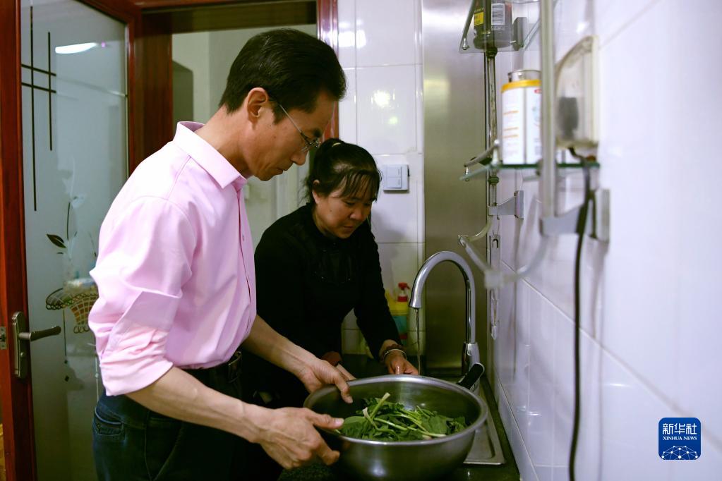 下班后朱彥軍和妻子在家里做飯(4月10日攝)。新華社記者 方欣 攝