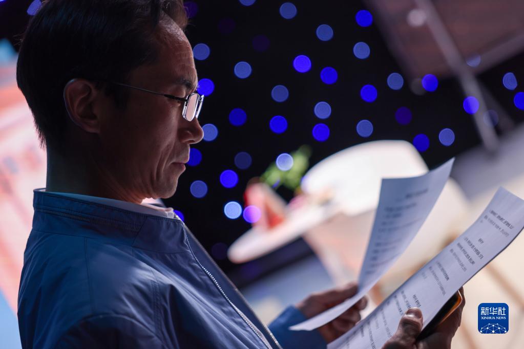 4月12日,在中國教育電視臺一處演播室,朱彥軍在節目錄制前進行最后的準備。新華社記者 劉金海 攝