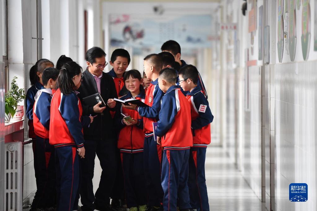 朱彥軍在靜寧縣城關小學和孩子們交流閱讀心得(4月10日攝)。新華社記者 陳斌 攝