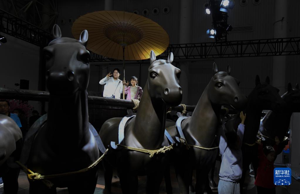 4月22日,觀眾在博覽會上體驗楚王車馬陣。