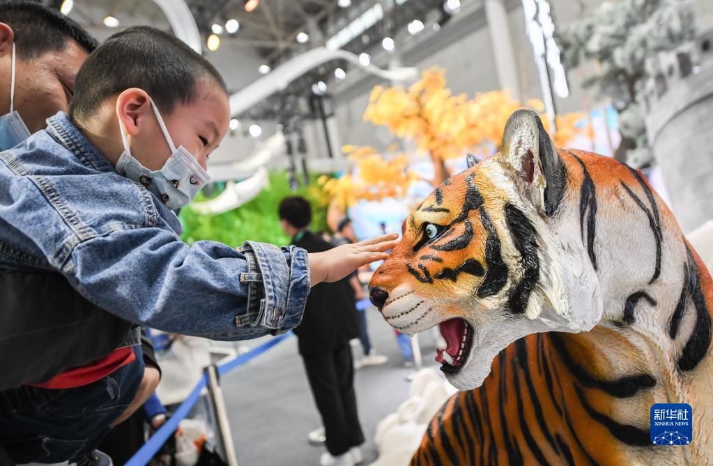 4月22日,一名小朋友在博覽會上觸摸老虎模型。
