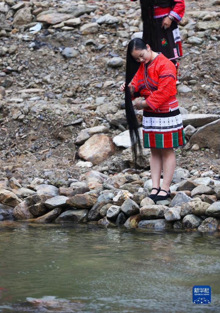 當日是農歷三月初三,廣西桂林市龍勝各族自治縣黃洛瑤寨舉行“三月三龍脊長發節”活動,吸引游客前來參觀游覽。黃洛瑤寨的紅瑤族婦女有世代相傳的蓄發習俗,平均頭發長度達1.7米,最長的有2.72米。