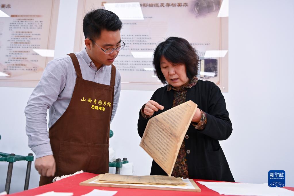 在山西省圖書館古籍修復中心,程文濤和修復導師邢雅梅(右)交流(4月21日攝)。
