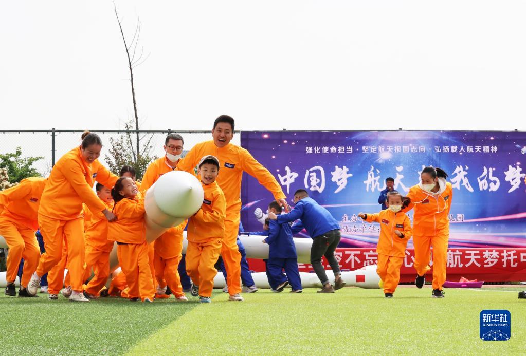 4月22日,在江蘇省連云港市海州區體育場,小朋友和家長參加航天主題親子游戲。