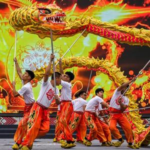 4月22日,在中國—東盟(南寧)非物質文化遺產周開幕現場,演員在表演舞龍。