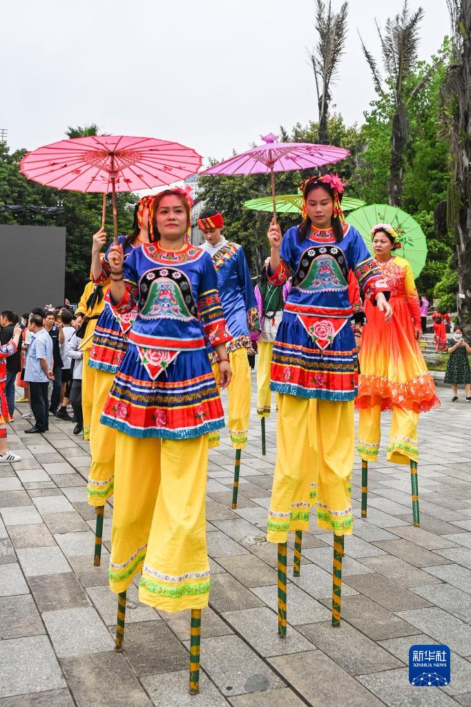 4月22日,在中國—東盟(南寧)非物質文化遺產周開幕現場,演員在表演踩高蹺。