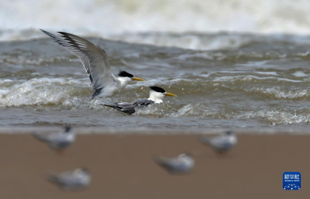 4月22日,兩只大鳳頭燕鷗在閩江河口濕地海面里洗澡。