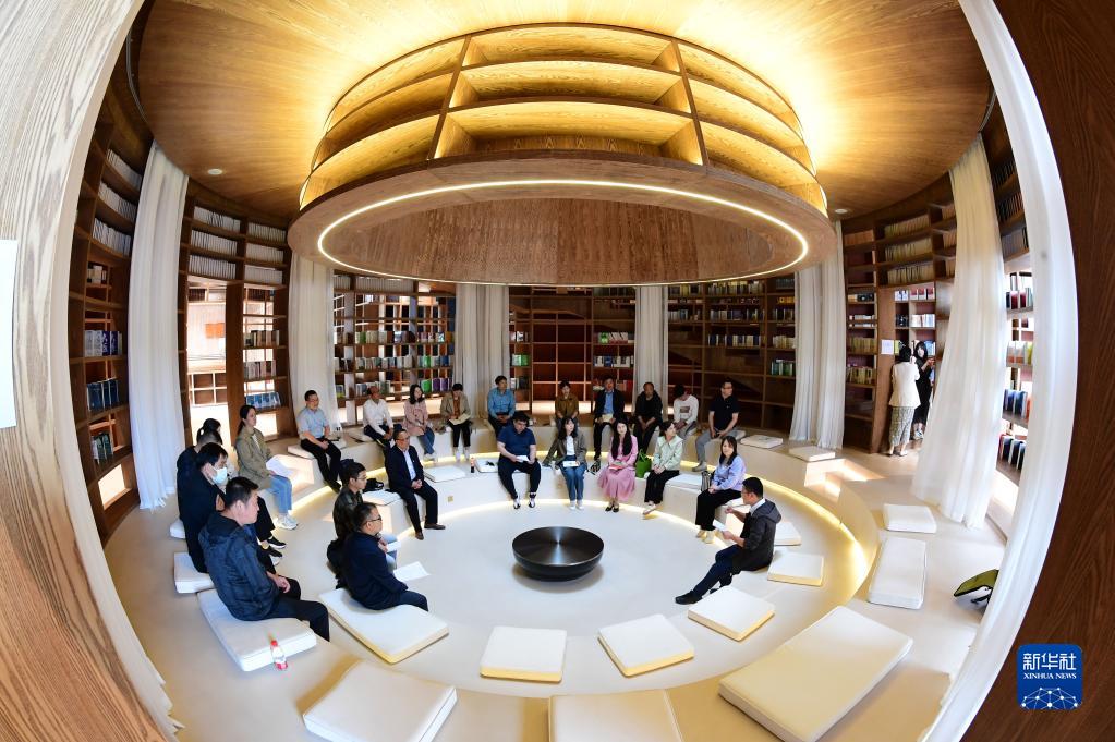 4月21日,人們在安徽省合肥市肥西縣一家民宿的書店里參加讀書分享交流會。