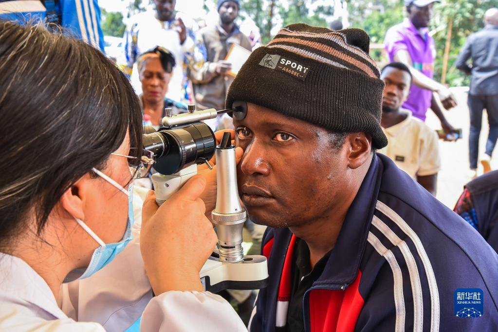 4月20日,醫療隊成員在喀麥隆首都雅溫得的義診活動現場為病患檢查眼睛。
