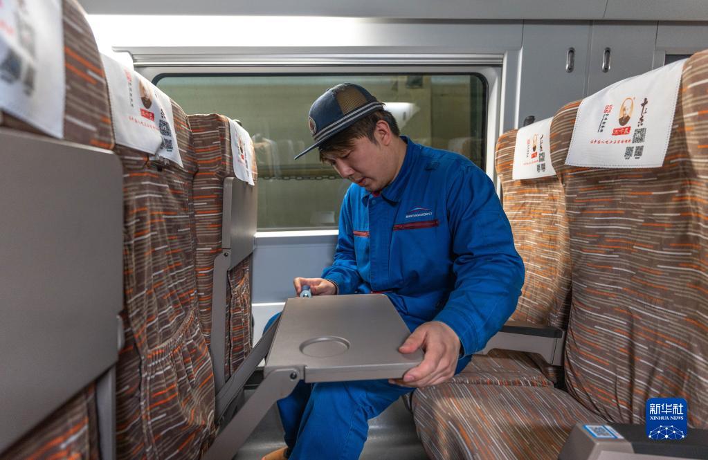 4月22日,在沈陽動車段沈陽北動車運用所,技術人員在列車內維修座椅桌板。