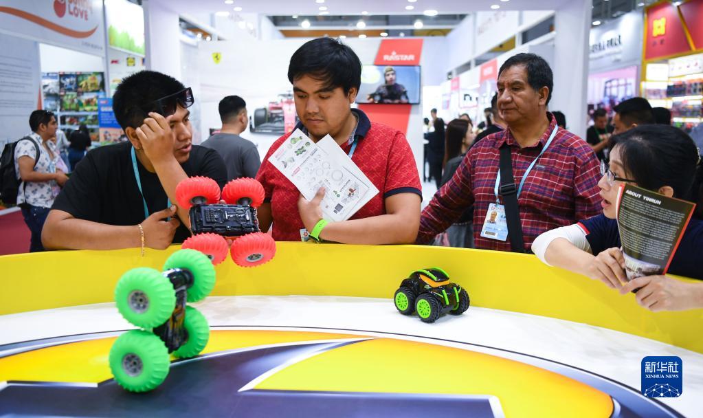 4月23日,采購商和參展商在遙控車玩具展區洽談。