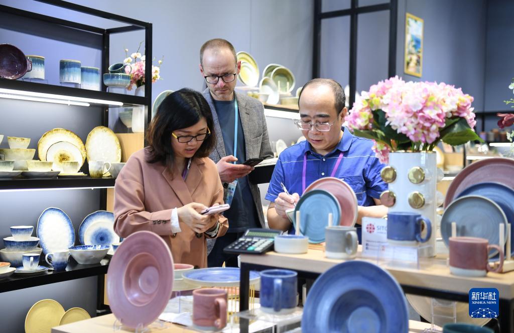 4月23日,采購商和參展商在瓷器展區洽談。