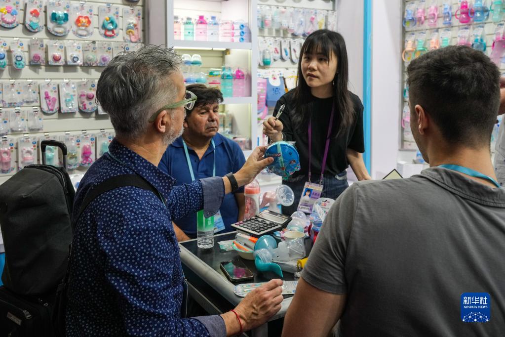 4月23日,采購商在第133屆廣交會二期孕嬰童展區選購嬰兒奶瓶。