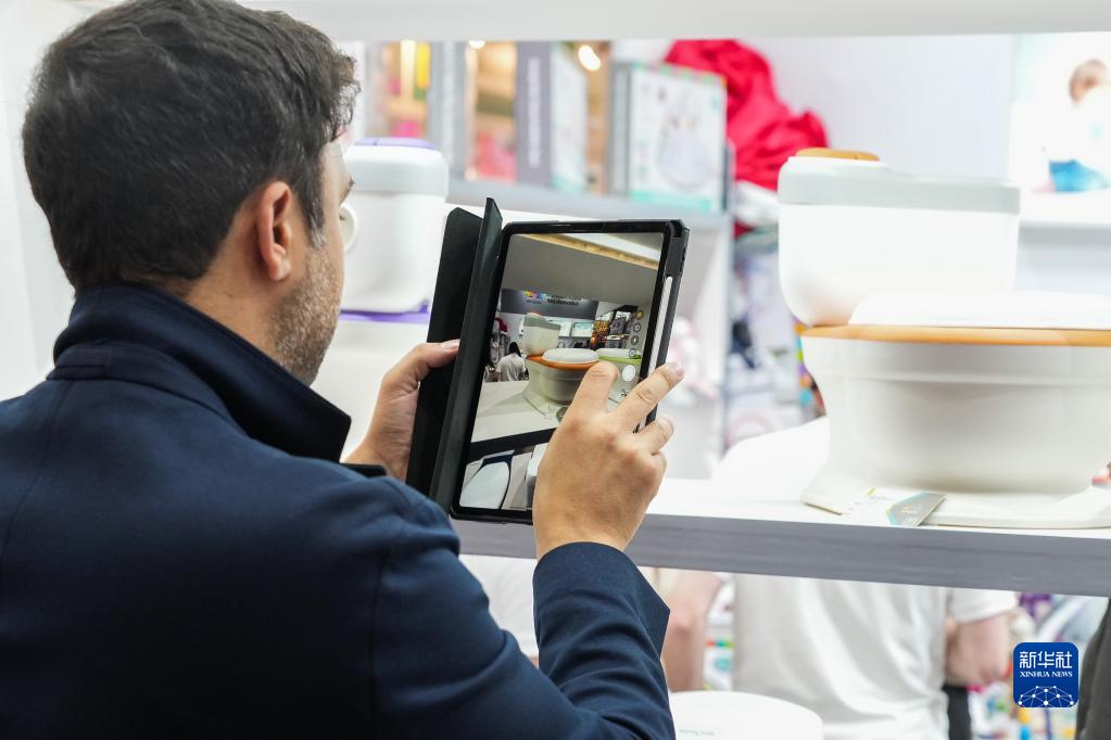 4月23日,一名采購商在第133屆廣交會二期孕嬰童展區拍攝兒童馬桶產品。