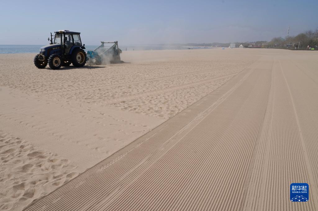 近日,旅游勝地河北省秦皇島市各浴場的工人開始對浴場的沙灘進行整理,精篩細沙,檢修旅游設備,準備迎接八方來客。