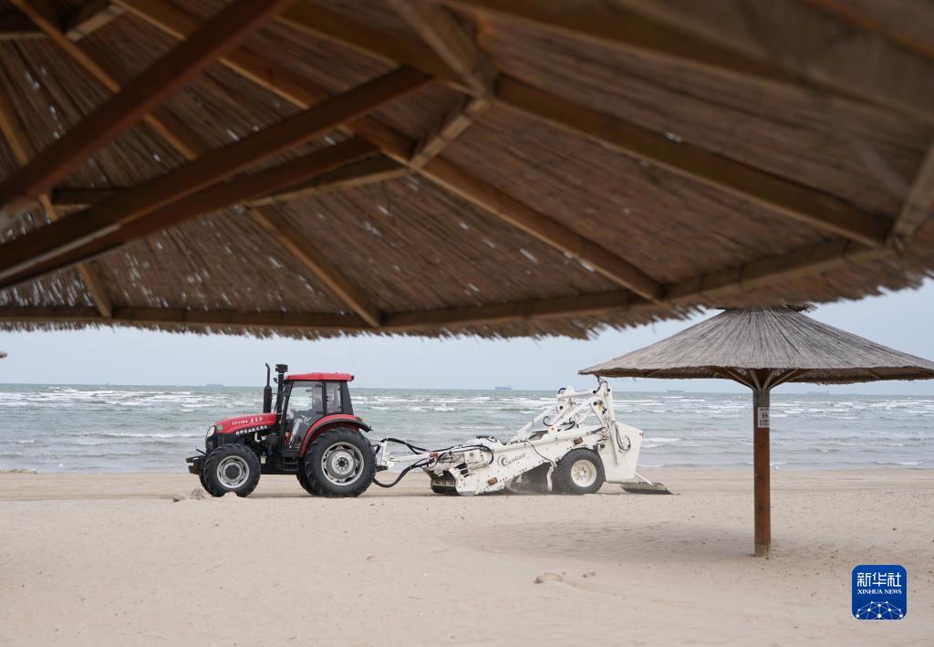 近日,旅游勝地河北省秦皇島市各浴場的工人開始對浴場的沙灘進行整理,精篩細沙,檢修旅游設備,準備迎接八方來客。