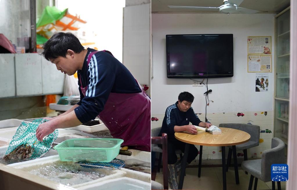 拼版照片:左圖為車站北菜市場的水產經營戶仇明紅在攤位上忙碌;右圖為仇明紅在菜場書屋內閱讀,他是這間菜場書屋里借閱量最高的攤主之一(4月19日攝)。