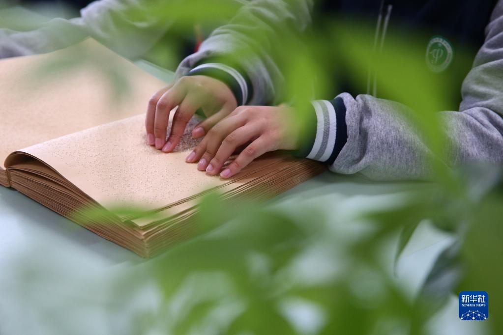 4月23日,在山東省濟南特殊教育中心閱覽室,視障學生在上閱讀課。