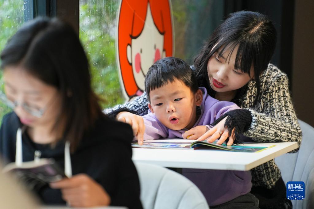 4月23日,在浙江省湖州市德清縣鐘管鎮“干山小鎮農家書屋”,一名小朋友在大人的陪伴下讀書。