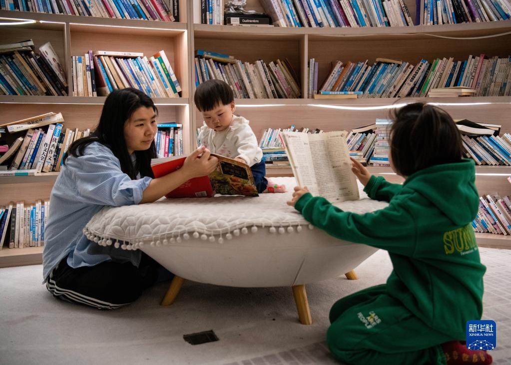 4月20日,在江蘇省東臺市七里漾書店兒童閱讀專區,家長帶領孩子讀書。
