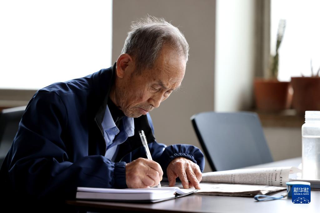 4月22日,在山東省棗莊市圖書館,市民在一邊閱讀報紙一邊寫筆記。