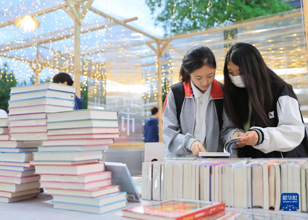 4月21日,在浙江省湖州市安吉縣圖書館廣場上,市民在“書香吉市”的線下書展上閱讀、挑選書籍。