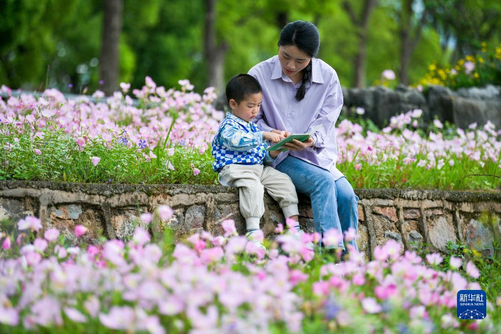 4月22日,家長帶著孩子在貴州省遵義市余慶縣一公園內讀書。