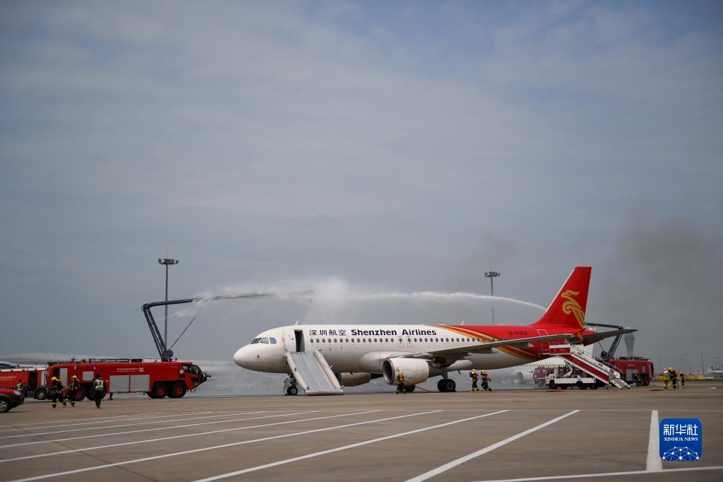 4月23日,在深圳機場舉行的演練中,航空器模擬因機械故障導致右發動機起火,消防員進行滅火。
