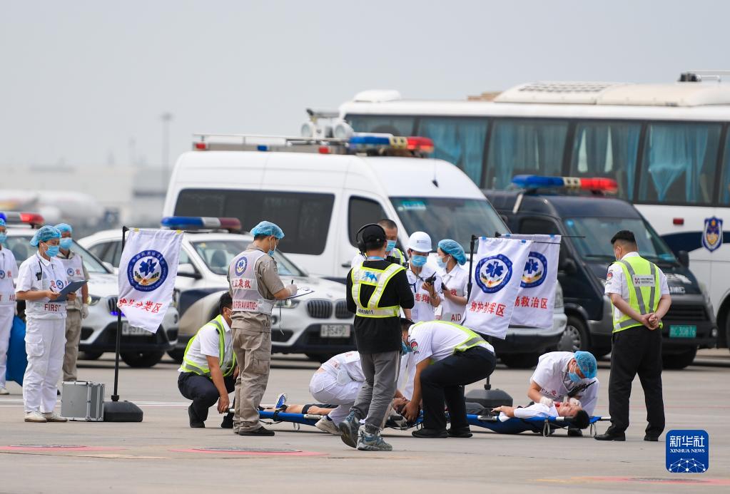 4月23日,在深圳機場舉行的演練中,醫務人員模擬對受傷的乘客進行檢查。