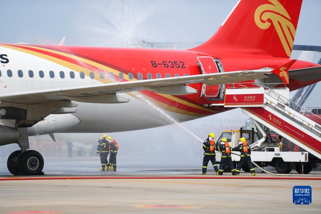 4月23日,在深圳機場舉行的演練中,航空器模擬因機械故障導致右發動機起火,消防員進行滅火。