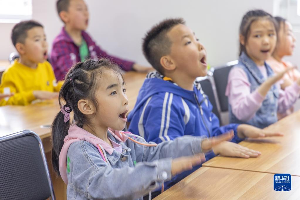 4月22日,在重慶市豐都縣三合街道平都東路社區,孩子們在誦讀課上做趣味口部操。