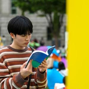 4月23日,一名男子在韓國首爾廣場上閱讀圖書。
