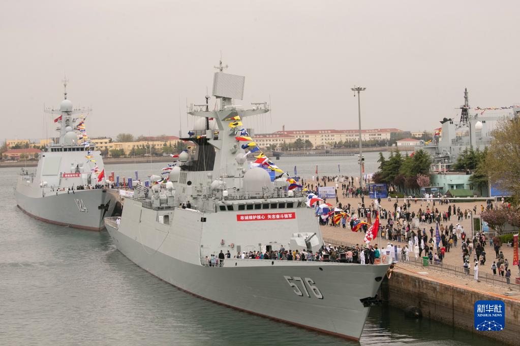 海軍在山東青島港3號碼頭組織艦艇開放活動,導彈護衛艦大慶艦(前)和導彈驅逐艦開封艦在靠泊展示(4月22日攝)。新華社發(孫飛 攝)
